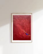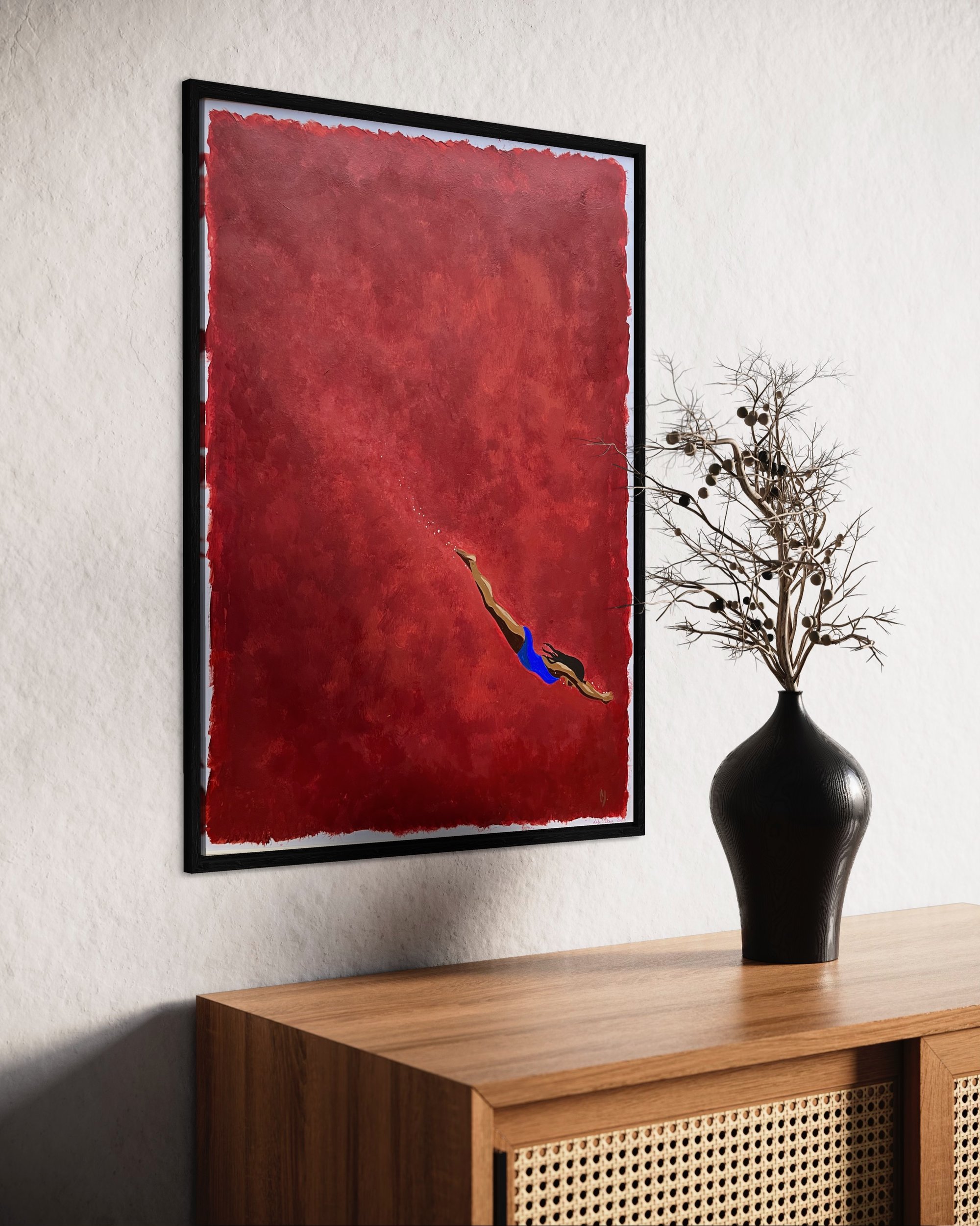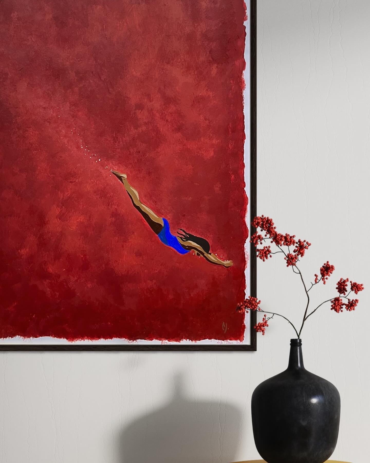 Willingly plunging into the dark the swimmer embraces this moment while at the same time faces some resistance. I chose this earthy and rich blood red colour that represents for me the uncontrollable and the unknown, somehow a little bit reminding me of fear but mostly of life. As feeling down can be overwhelming, it is though a natural state of mind that one should not try to overcontrol, but rather sometimes dive into it.